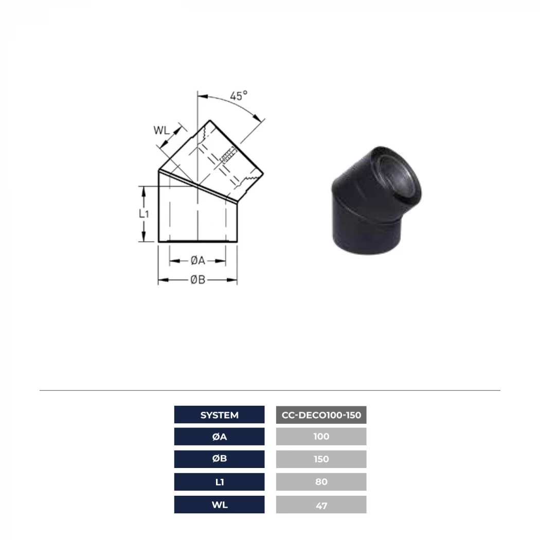 Bøjning på 90 grader til balanceret aftræk til indendørs gaspejse. System CC-DECO 100-150.